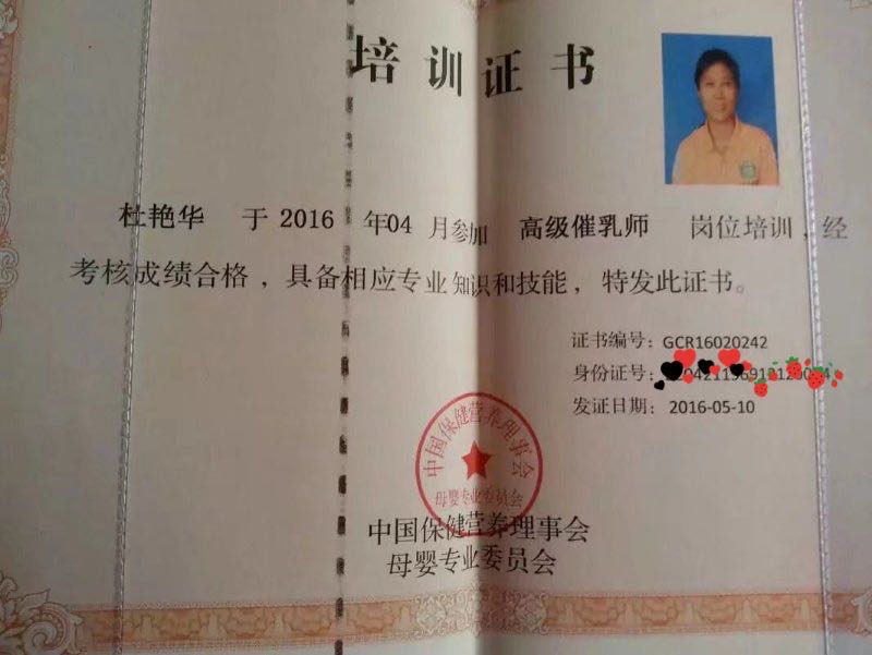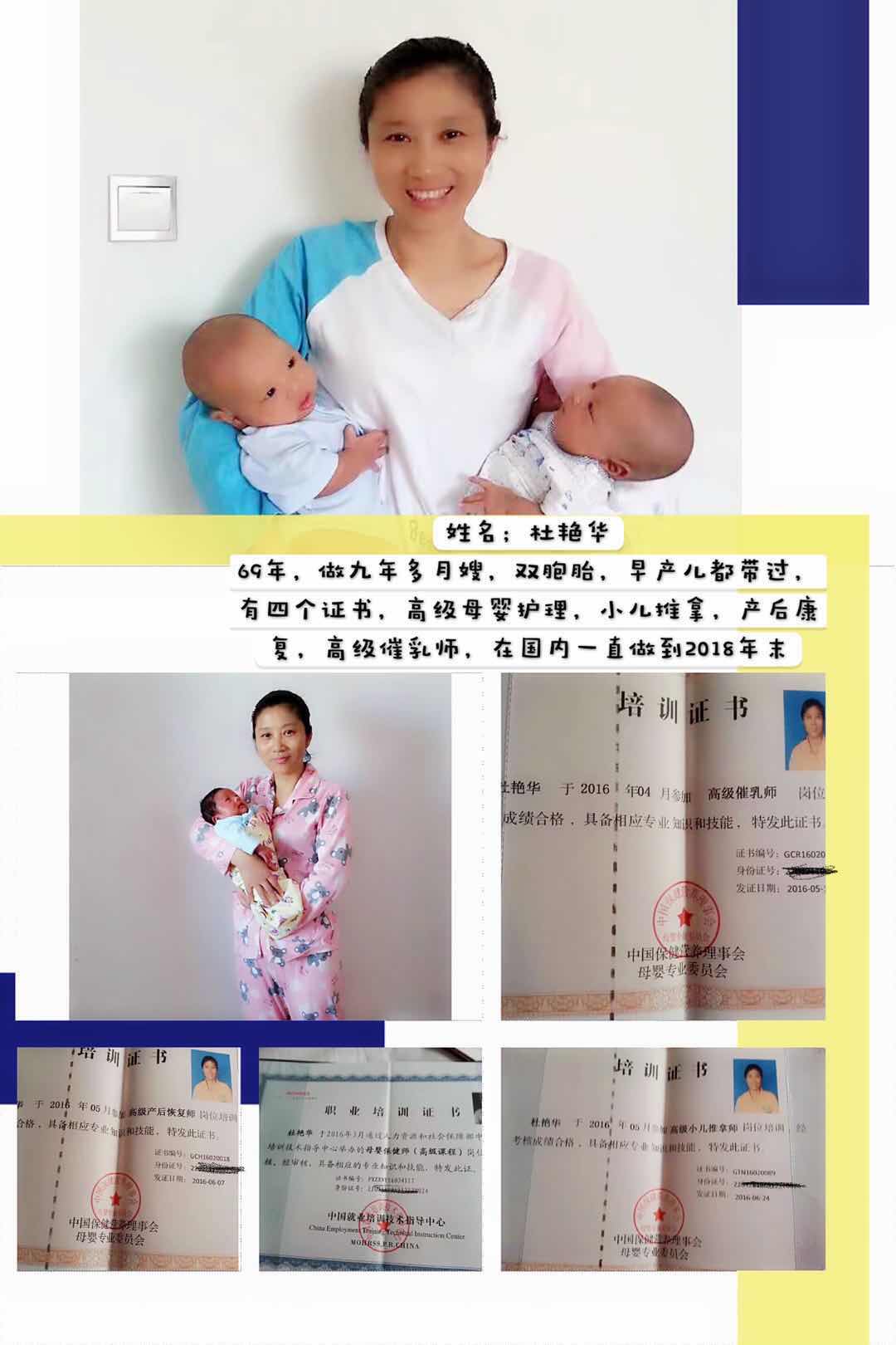杜阿姨是个认真负责的月嫂,对宝宝非常有耐心,发自内心的喜欢宝宝,做事勤快,主要是专业知识丰富,遇到宝宝有任何问题知道如何解决。证书都是货真价实的。推荐给各位宝妈。