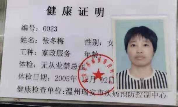 | 姓名: | 张冬梅 | 年龄: | 55 | 籍贯: | 浙江省,瑞安市 高楼 | |