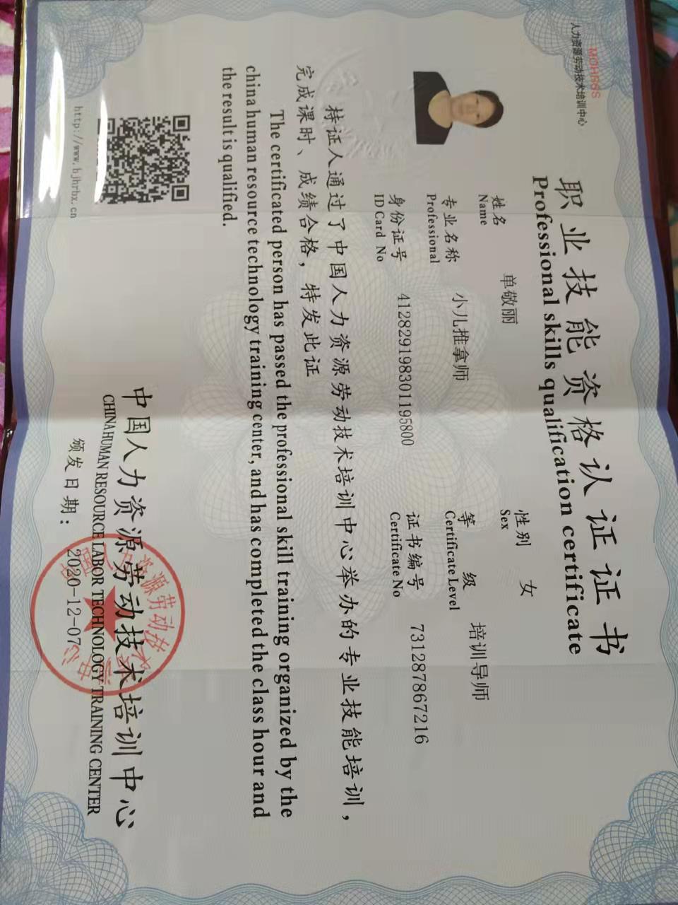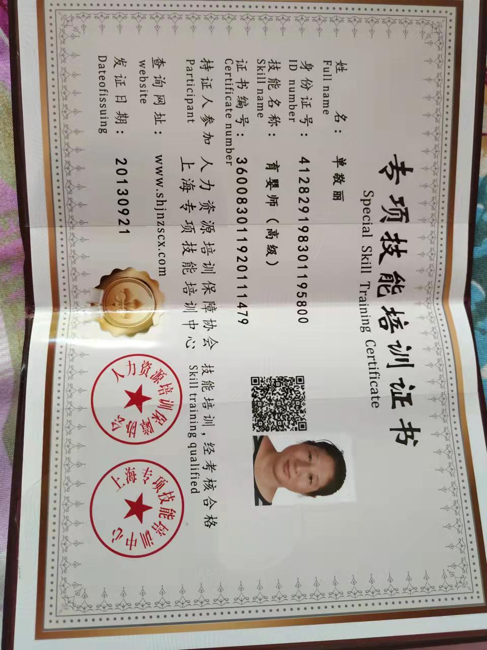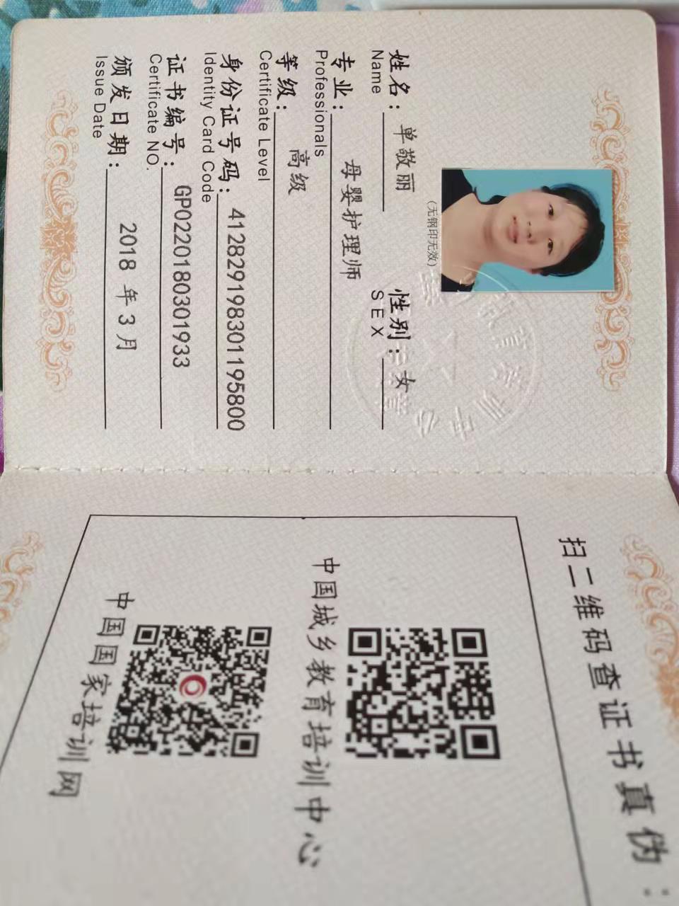 | 婚否: | 已婚 | 民族: | 汉 | 证书: | 母婴护理,催乳证 | |