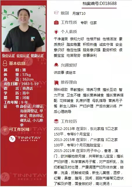 2012年开始做育婴,2015年开始在深圳月子中心,香港,澳门,欧洲等地做月嫂共带新生儿宝宝,擅长产妇护理,科学营养月子餐,对产后积乳,涨奶都能及时处理,产康调理产妇形态恢复,按摩,洗澡,抚触被动草,新生儿黄疸,湿疹,红臀,鼻塞,腹泻,哭闹,肠胀气等常见症状了解及护理,面食做得好,南北煲汤